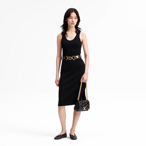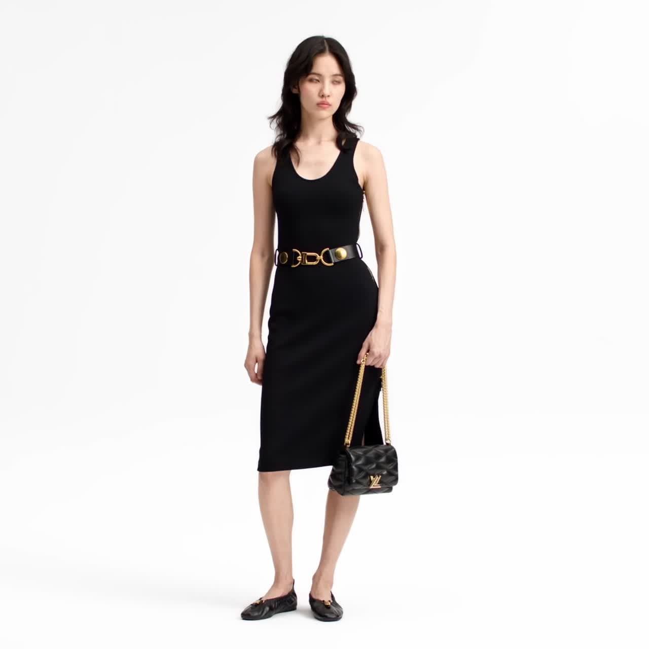 Gaun yang dibuat dari bahan campuran rayon dan crepe jersey ini tampil dengan sejumlah detail memikat. Desainnya memadukan bagian atas bergaya tank top dan bagian rok yang memanjang hingga lutut. Sementara bagian pinggang terlihat modern dengan ikat pinggang yang lebar disertai aksen stud keemasan dan carabiner clip berukuran besar.