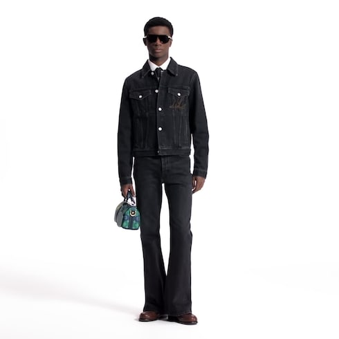 These flared jeans, crafted from premium Japanese denim, are a wardrobe essential enhanced with Louis Vuitton savoir-faire. With their timeless black wash and fashion-forward silhouette, they can be effortlessly styled with any look. Exclusive details include an embroidered LV signature in tobacco-toned topstitching on a rear pocket and signed nubuck patches on the ticket pocket and waist.