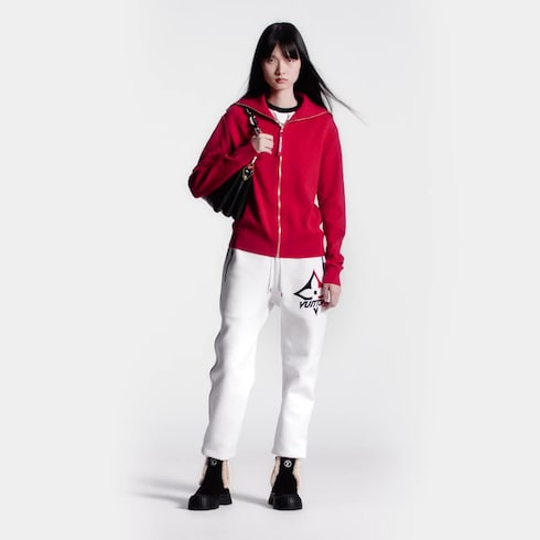 Terbuat dari bahan cotton interlock jersey halus, jogging pants ini tampil sporty dengan detail ribbing kontras di pergelangan kaki, serta saku berpenutup di bagian samping. Aksen jahitan di bagian luar menghadirkan nuansa warna bendera Prancis, merah dan biru, sementara logo LV Snowflake berukuran besar khas musim ini terlihat di bagian pinggul kiri.
