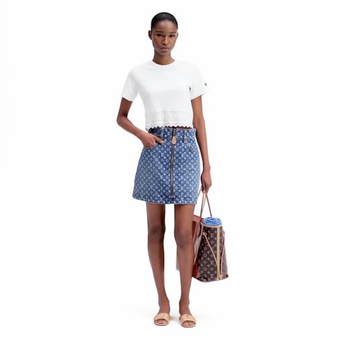 Mini skirt edisi musim ini hadir dalam bahan Monogram denim disertai aksen jahitan bernuansa kuning yang kontras. Bagian pinggang yang lebar menyajikan kesan ramping pada desain rok dengan model A-line yang rapi. Detail fungsional terlihat melalui penutup ritsleting di bagian depan dan carpenter loop pada saku belakang.
