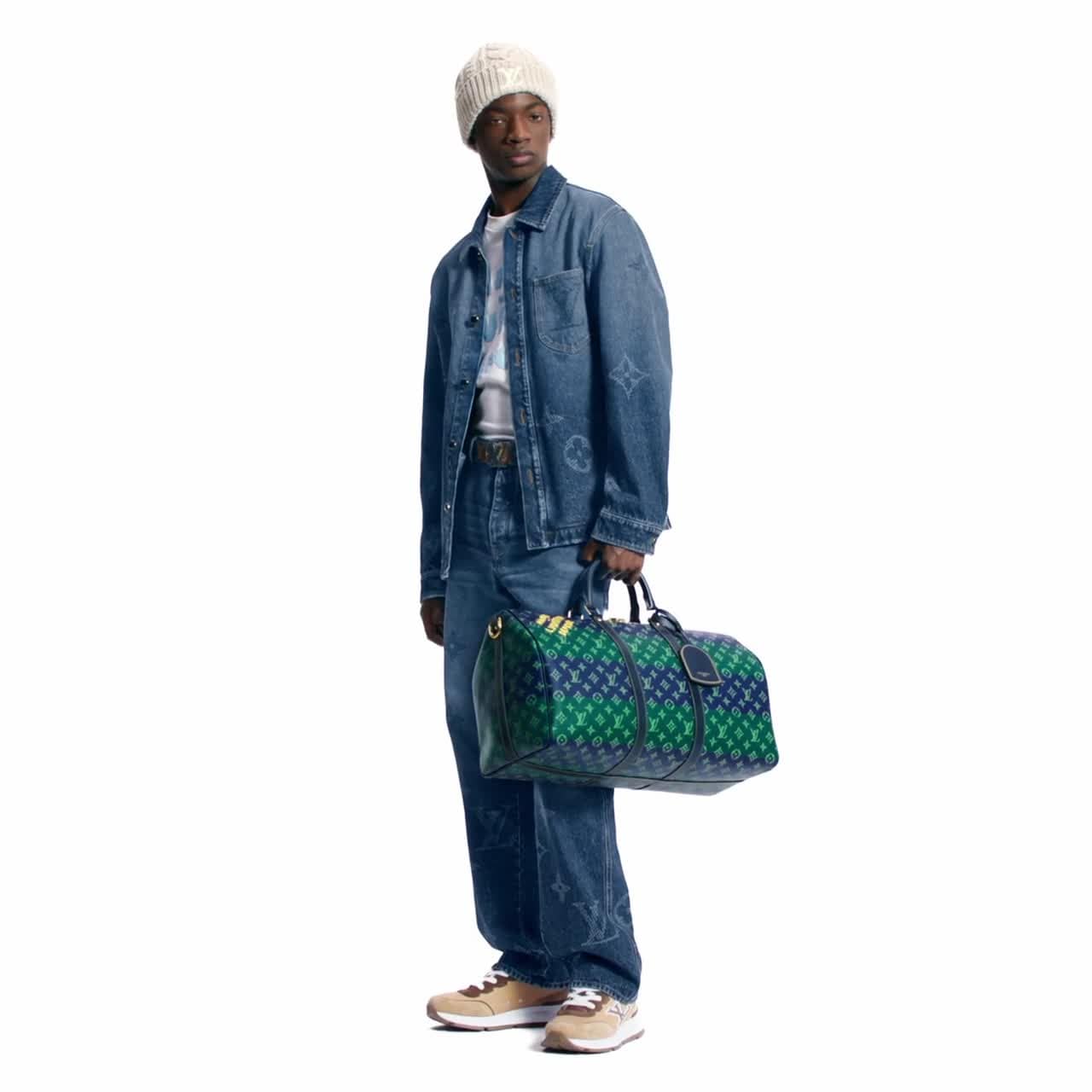 This organic denim workwear overshirt has an easy relaxed fit with a washed vintage finish. It is adorned with a Monogram Seeds motif with a tonal gradient effect. It has two chest pockets, one of them internal, and is signed with an embossed leather signature patch above the hem at the back. Matching pants make a total look.