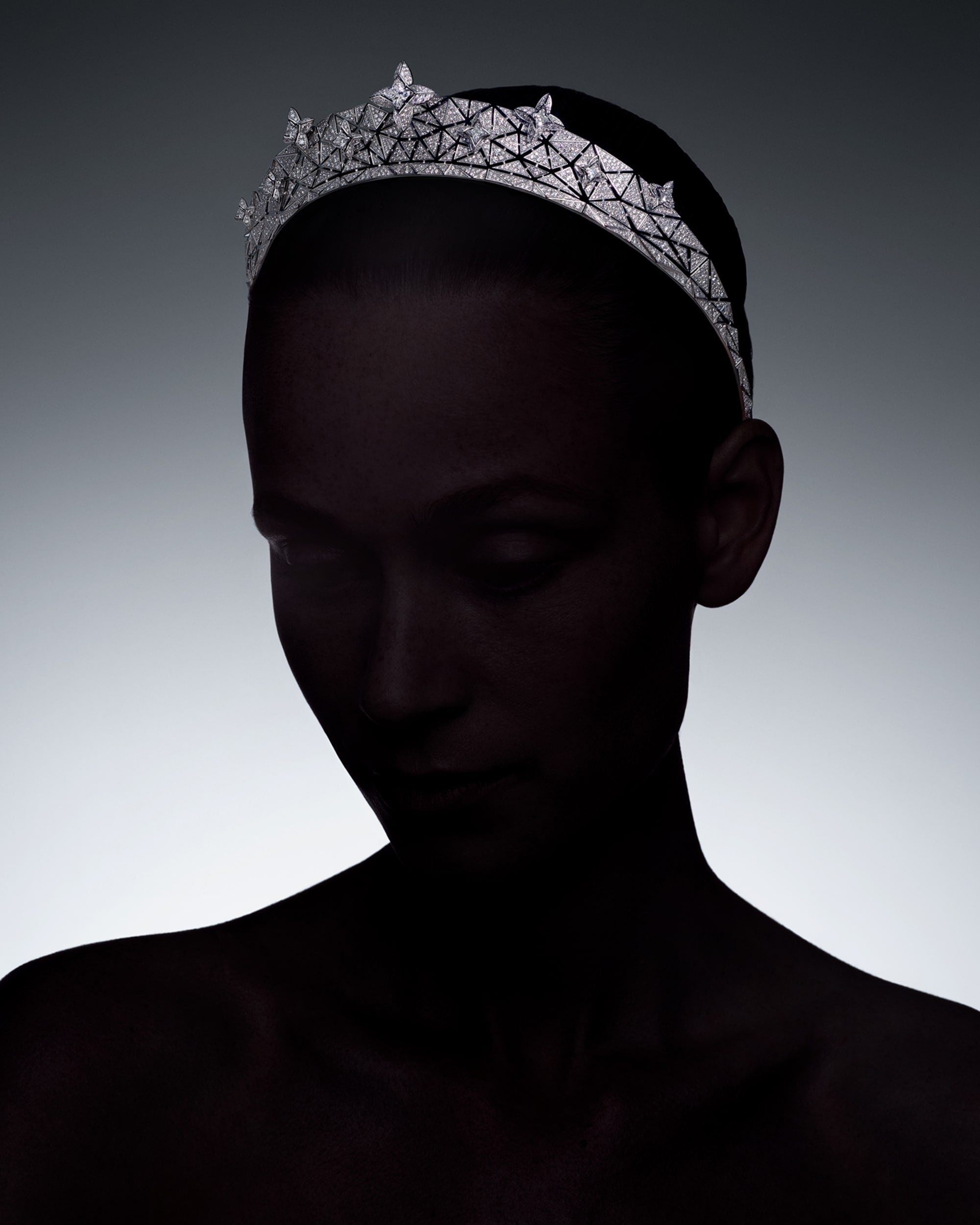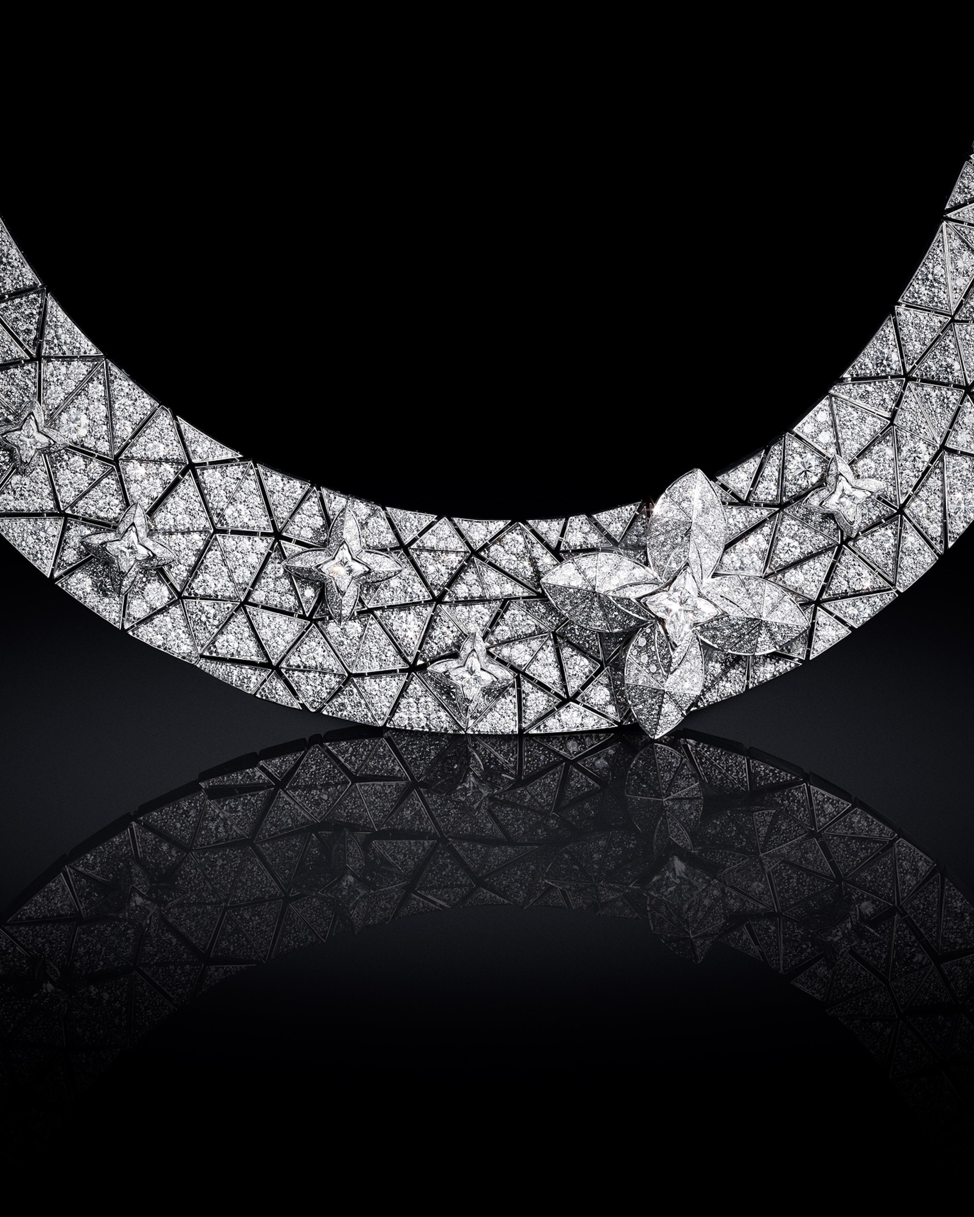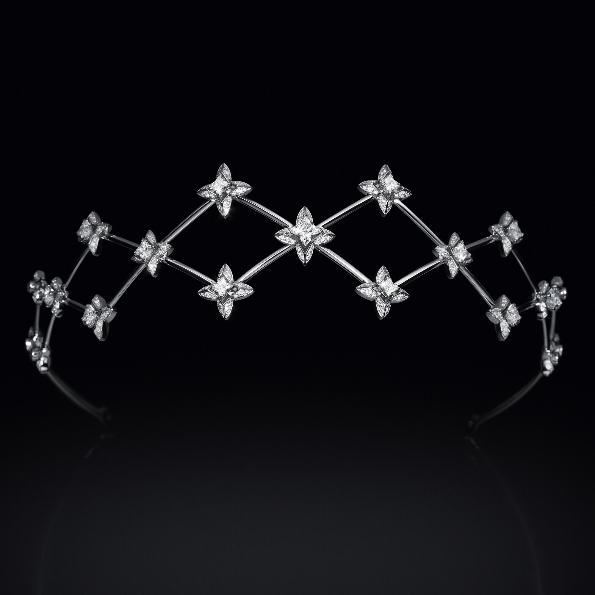 Eksplorasi keindahan murni dari berlian, Élégance meresonansikan kecemerlangan sebuah kreasi istimewa. Bentuk V khas Rumah Mode hadir lewat pola interlocking, dipermanis dengan berlian berbentuk LV Monogrm Star, sebagai pusat perhatian kreasi tiara pertama Rumah Mode.