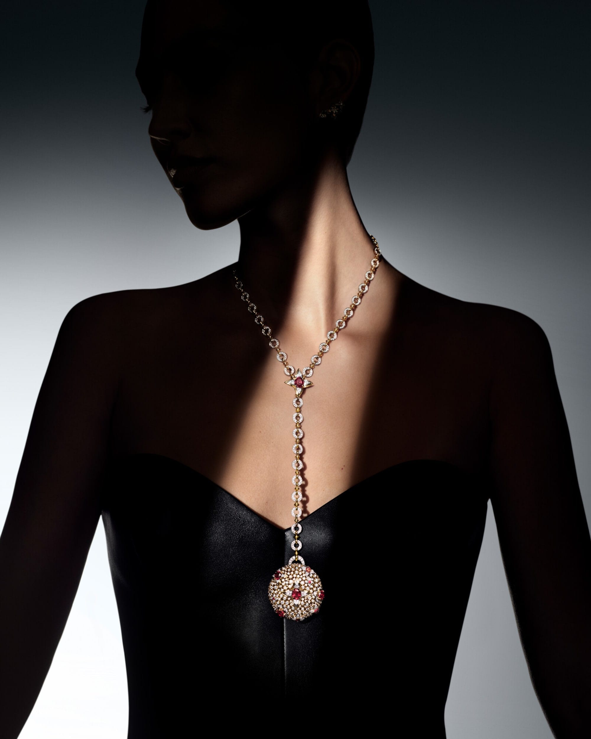 Mengemulasikan kontur ornamen interior imperial, Splendeur menghadirkan imaji floral woodwork dalam sebuah tribut bagi Monogram Flower ikonis. Ditata dengan lebih dari 110 batu ruby, perhiasan istimewa ini memancarkan aura karismatik - dirancang spektakuler, di antara batu permata berukuran besar yang pernah ditampilkan dalam sebuah perhiasan.